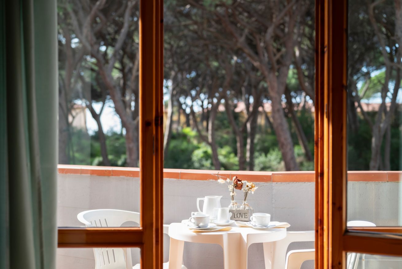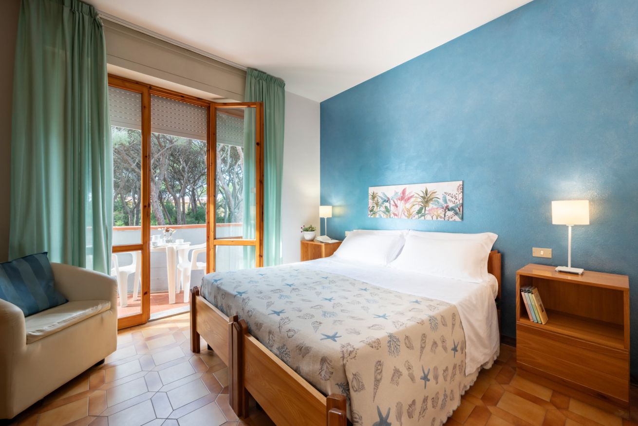 Le nostre camere matrimoniali vista pineta di 16 mq, offrono un letto matrimoniale o su richiesta la possibilità di due letti singoli, un bagno finestrato, privato e completo con cabina doccia ed un balcone attrezzato di tavolo e sedie che affaccia sulla pineta che separa l’Hotel dalla spiaggia di Follonica (soli 500 metri)